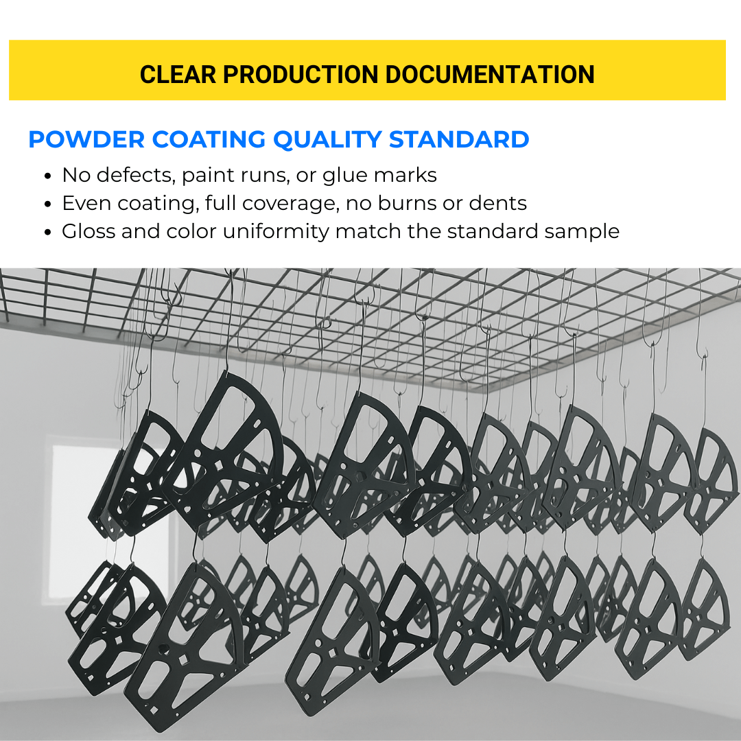 | 5. Powder Coating | Spray booth & oven | Uniform finish, color match, anti-rust protection |