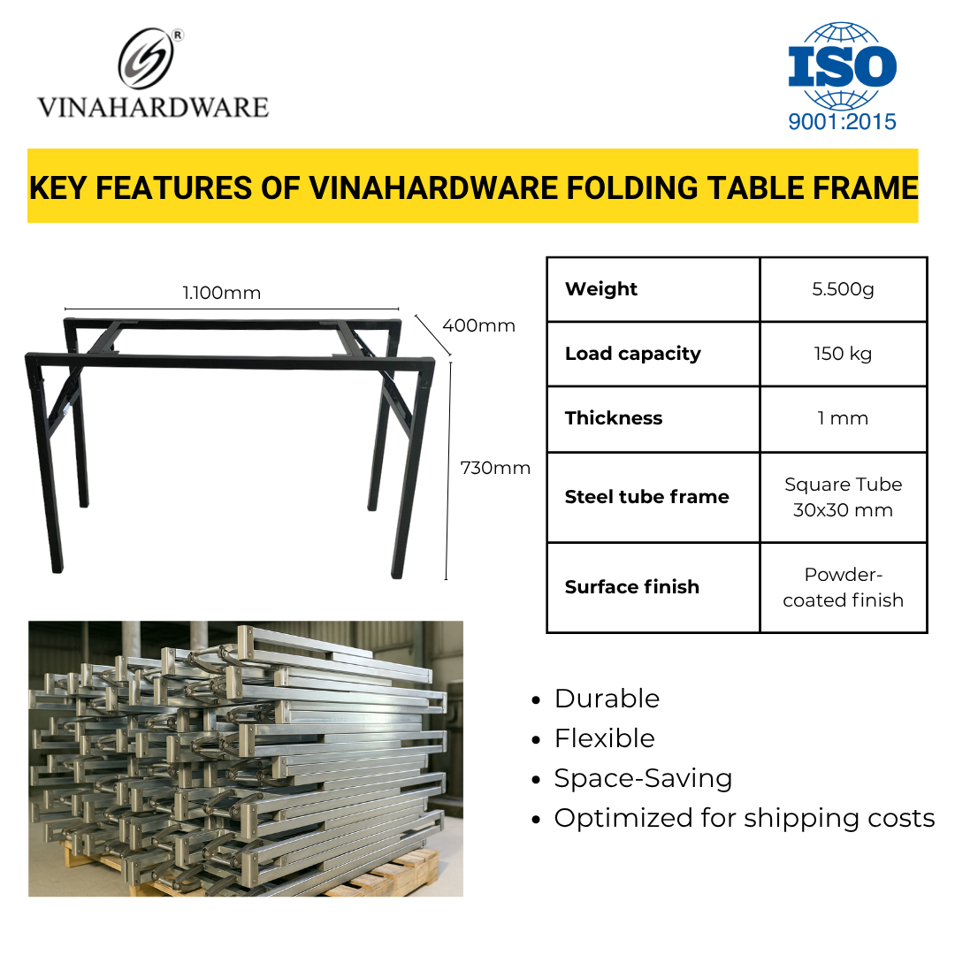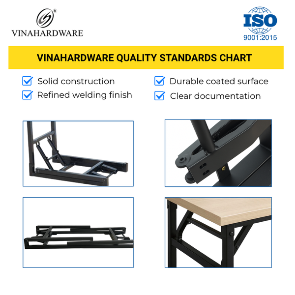 The 2300.1.11026 folding table frame by Vinahardware is a professional-grade, export-ready frame engineered for versatility and durability. Designed to serve multiple markets — outdoor catering, corporate offices, banquet halls, restaurants, hotels and temporary event setups — this folding frame provides fast deployment, compact storage and reliable daily function. It supports a wide range of tabletop materials including MDF melamine, high-pressure laminate (HPL), compact laminate, PVC-faced tops and stainless steel tops, while meeting international quality and packaging standards for global shipping.