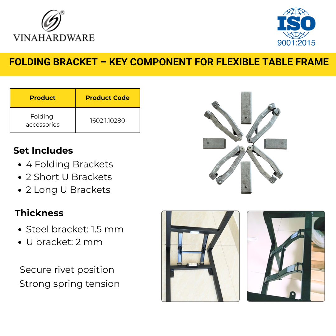 Folding Mechanism: Precision punched and folded mounting brackets (gussets) with welded hinge assemblies provide stable open position and secure locking. The foldable legs tuck neatly beneath the top, enabling flat-pack shipping and compact onsite storage.