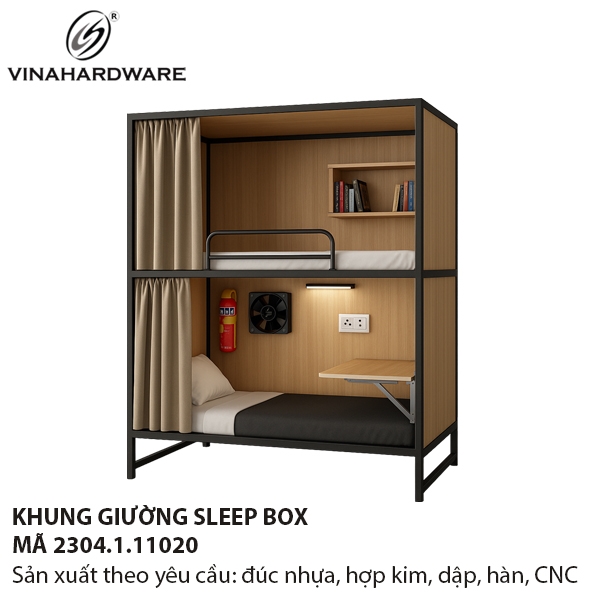 Sleep Box Bunk Bed Frame 2304.1.11020 – Size 850×2000mm, Customizable with Fireproof Panel, Fan, Curtain, Light, Foldable Desk, Power Outlet, Mattress & Bookshelf