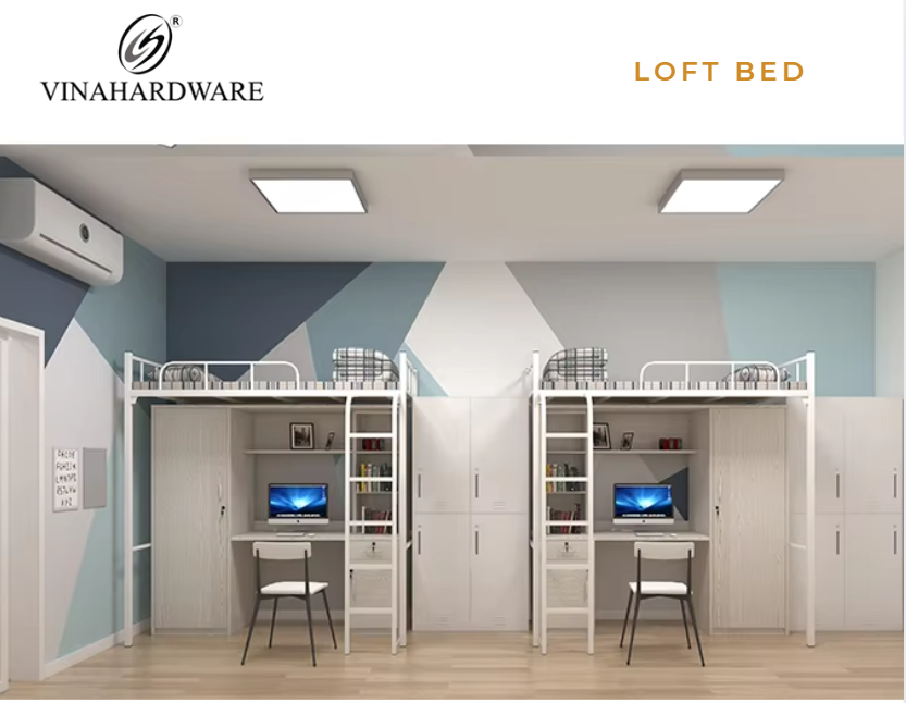 The Vinahardware bunk bed combined with a wardrobe and desk is a smart, multifunctional piece of furniture designed to optimize living space, making it especially suitable for compact rooms and dormitories. The upper level serves as a safe sleeping area with sturdy guardrails, while the lower level integrates a convenient desk and a spacious storage wardrobe. The product is made of moisture-resistant wood, meticulously treated to ensure durability and health safety. Its surface is coated with non-toxic electrostatic paint, enhancing aesthetics and making it easy to clean. The intelligently designed wardrobe, drawers, and open shelves provide organized and tidy storage space. The sturdy stairs with anti-slip surfaces, combined with a robust bed frame, ensure safety and convenience during use. With a modern style, diverse color options, and sleek lines, the bunk bed with wardrobe and desk not only saves space but also adds a striking touch to any living area. It is an ideal choice for families with children, students, or anyone looking to maximize their bedroom space efficiently.